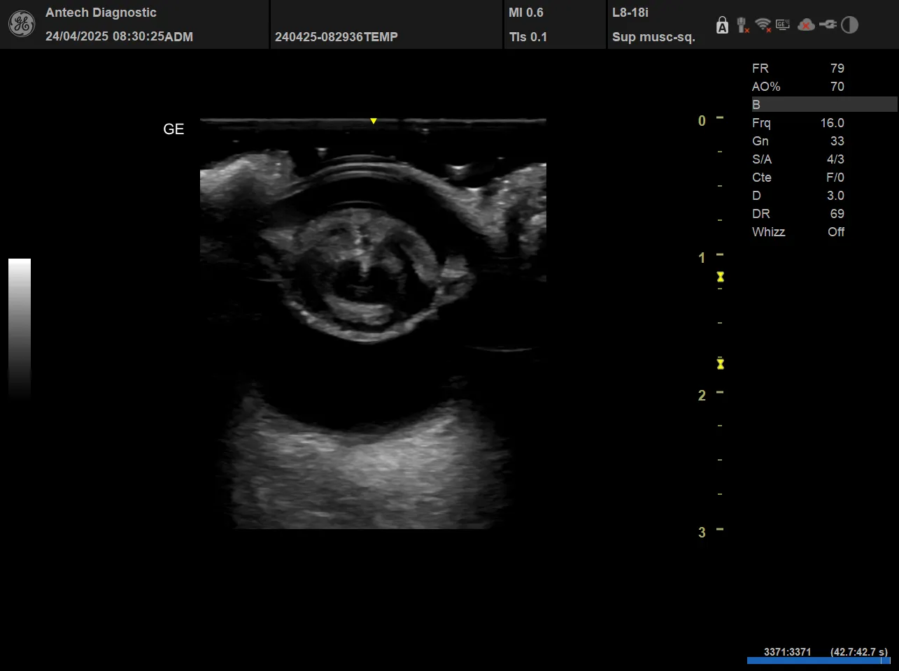 Echographie axiale d’un oeil de chien atteint de cataracte diabétique